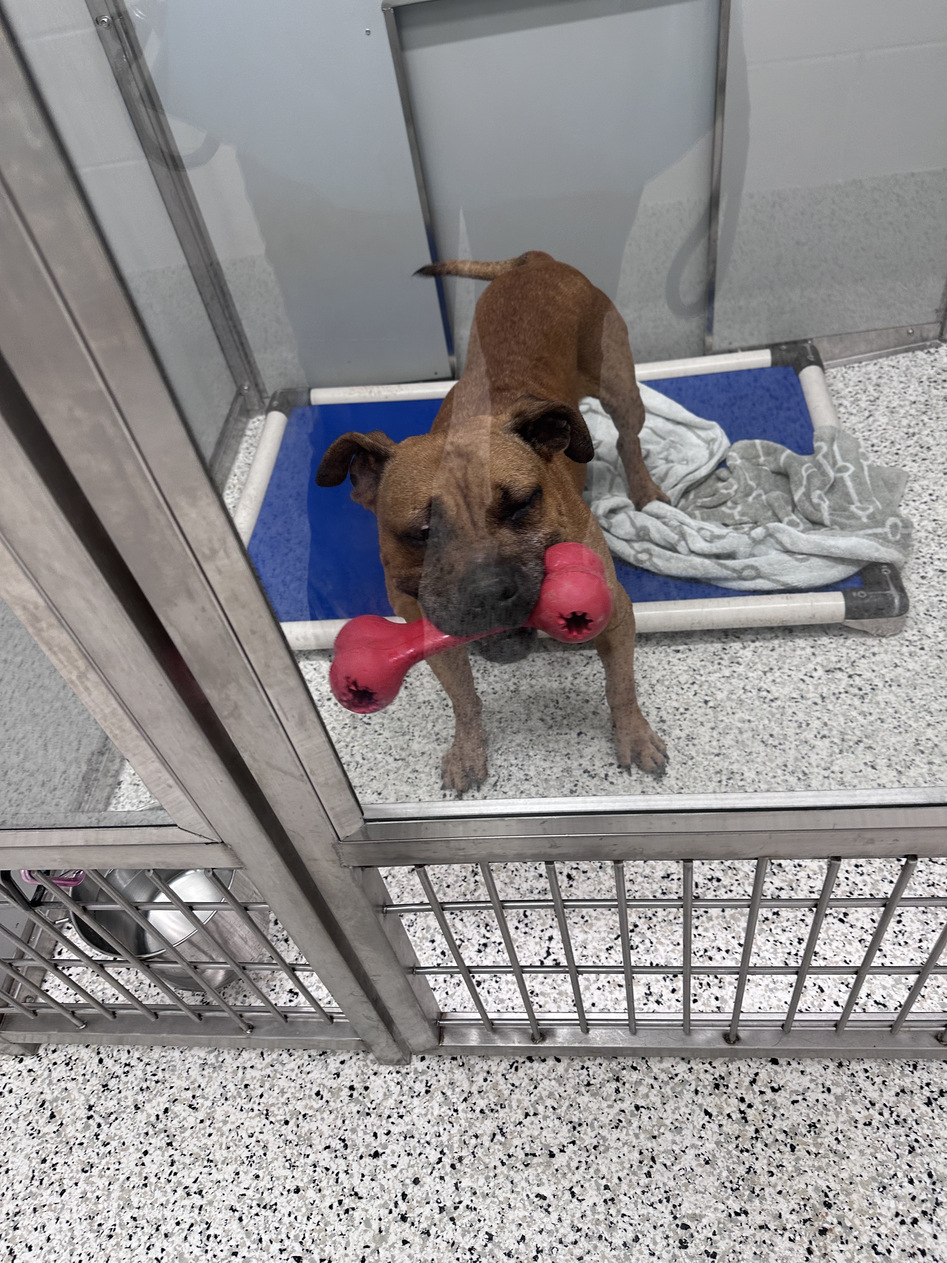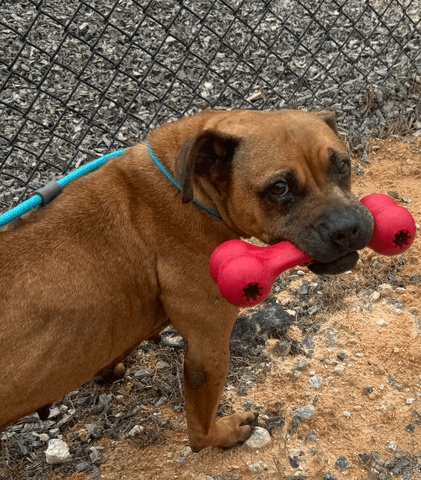Zlata has had some problems with leash biting in the shelter due to the lack of physical and mental stimulation, but having her toy to focus on helps a lot.